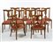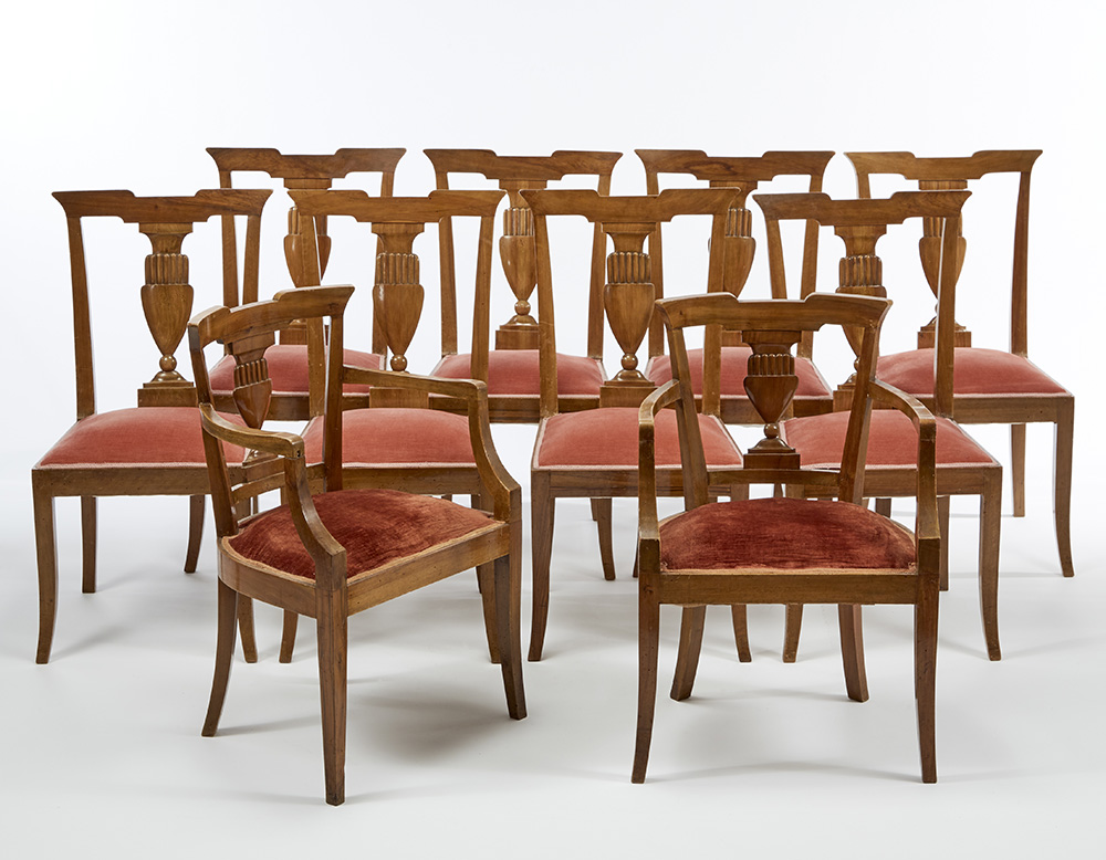 Otto sedie e due capitavola Novecento. Italia, 1935ca. Legno di noce massello intagliato, con schienale ad anfora costolata. (cm 52x82x47,5) (lievi difetti)