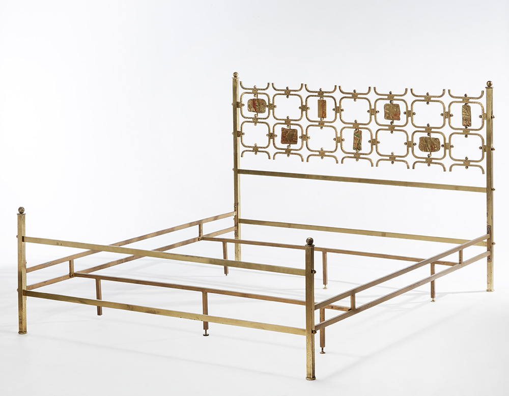 A double-bed. 1950s/1960s. Brass structure, brass sightly polychrome glazed panels. (170x122x210 cm.) (slight defects)