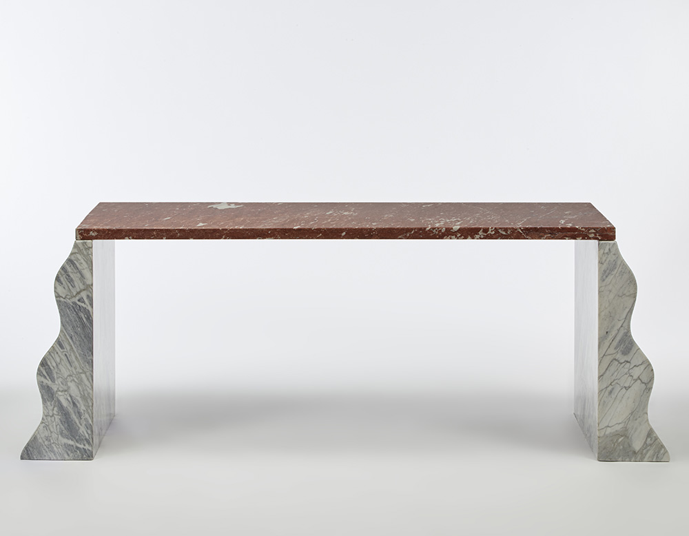 Table model "Montenegro". Produced by Ultima Edizione, Massa Carrara, 1980s. White veined Carrara marble and red marble. (211x72x60 cm.) (slight defects)