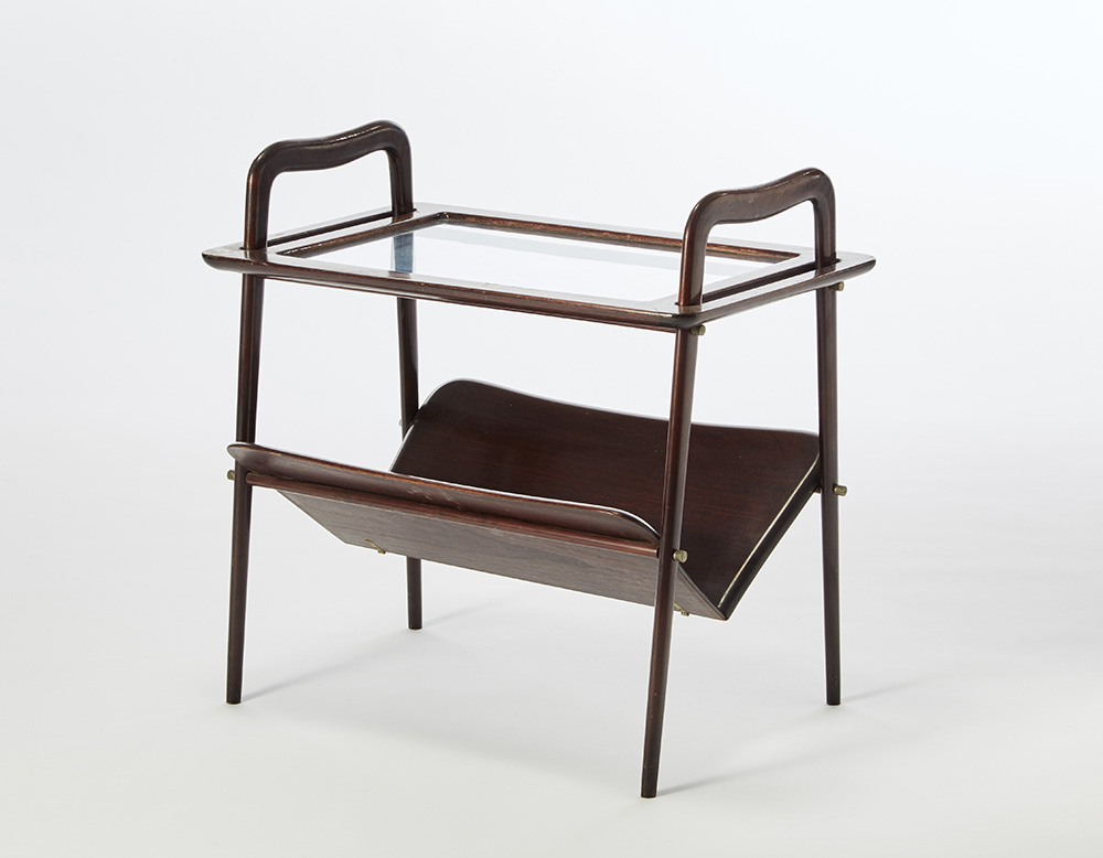 Portariviste modello "201". Produzione De Baggis, Cantù, 1953. Piano asportabile in vetro con cornice in legno, struttura in legno massello di palissandro indiano. (cm 56x54x35,5) (lievi difetti e mancanze)
