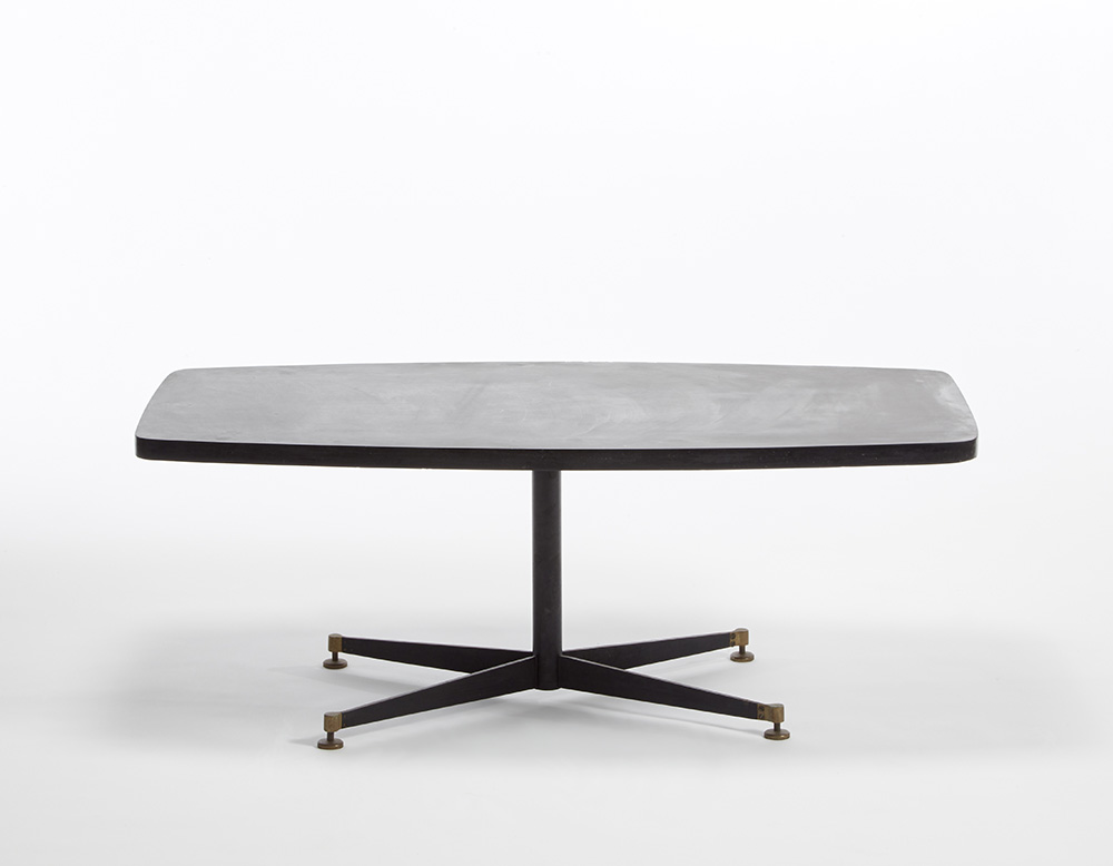 Tavolo da salotto. Produzione Azucena, Milano, anni '50. Struttura in ferro verniciato nero, piedini regolabili in ottone, piano a losanga in pietra di Lavagna. (cm 120x46x60) (lievi difetti)