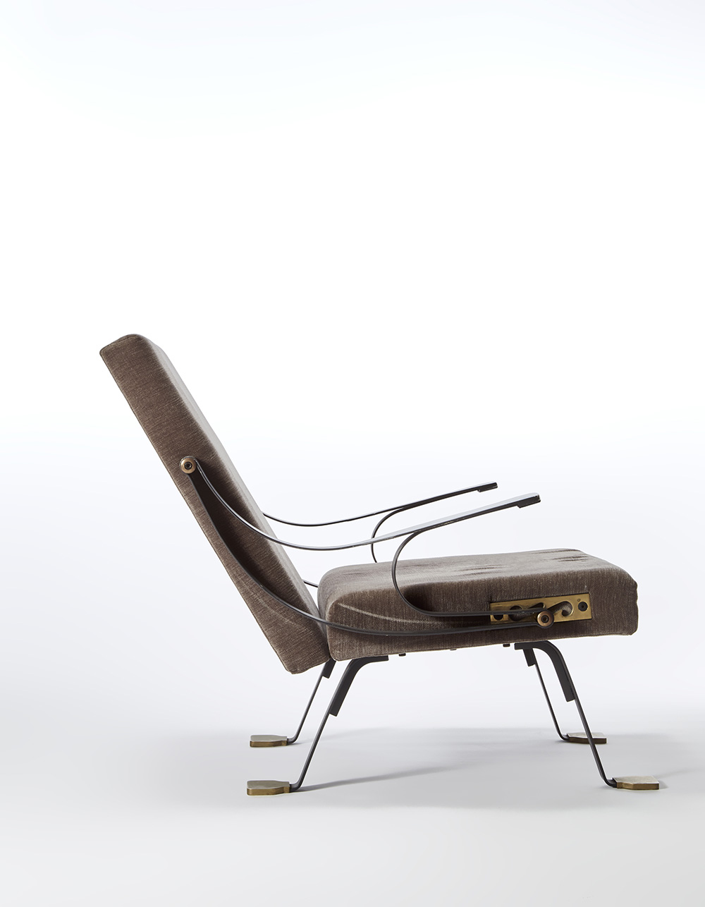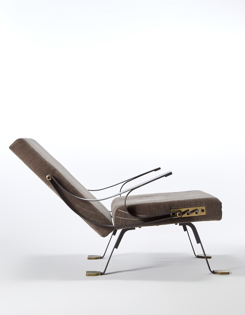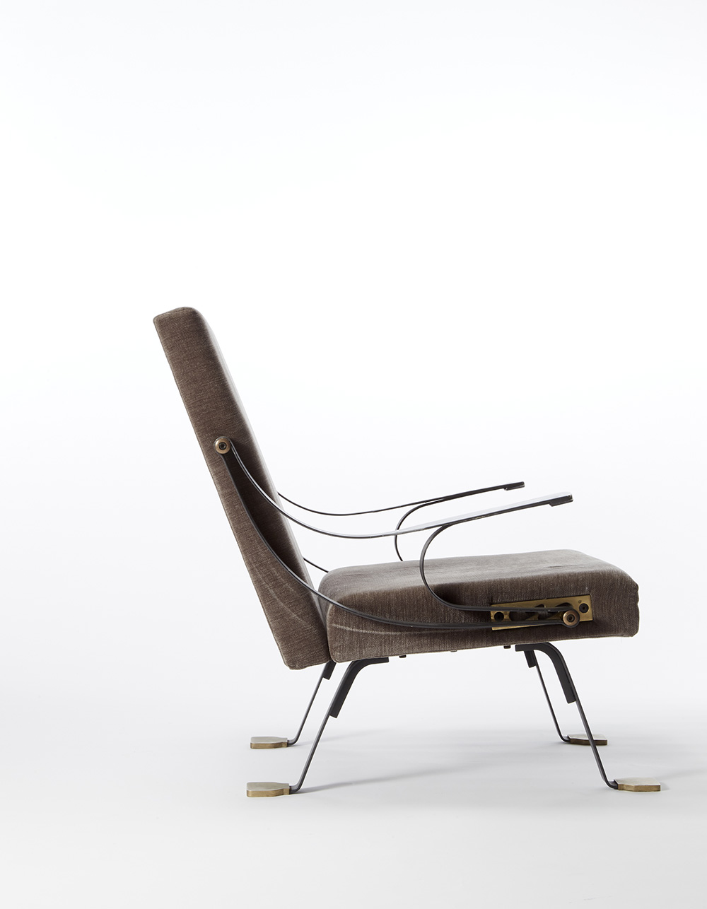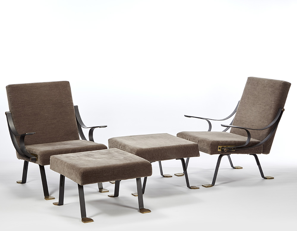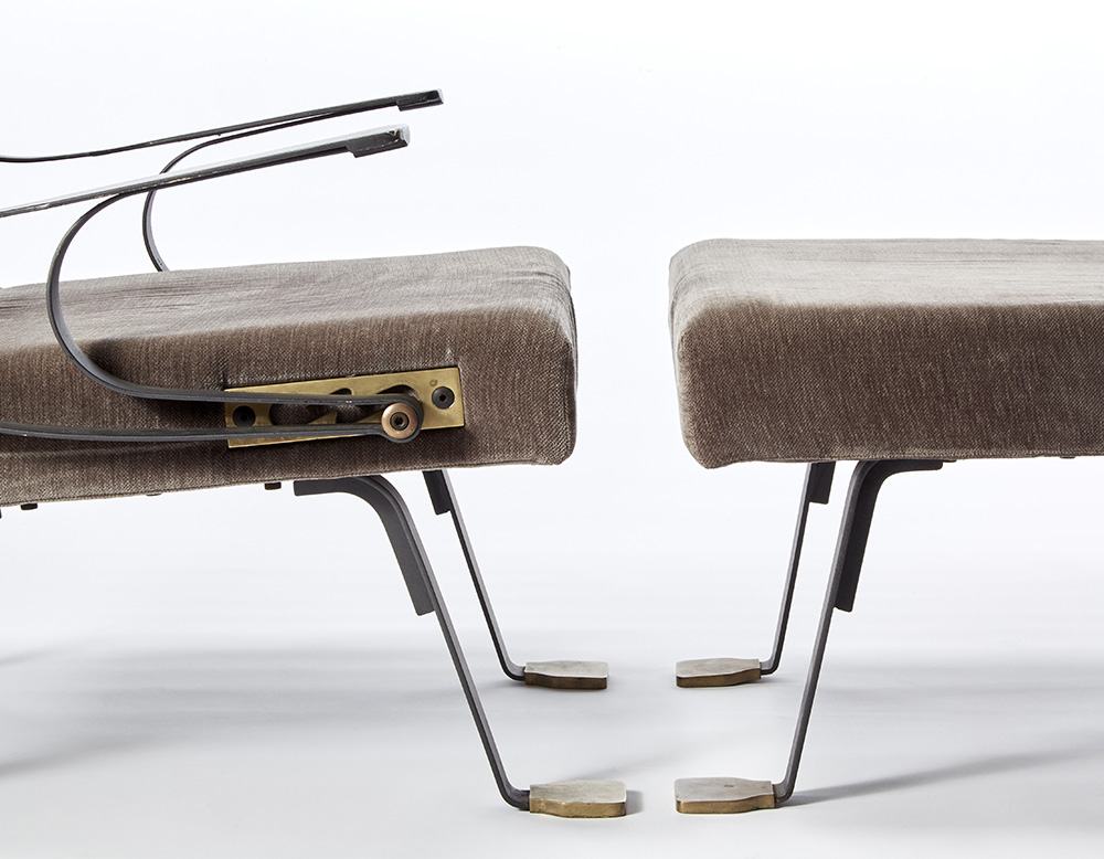 Coppia di poltrone con poggiapiedi modello "Digamma". Produzione Gavina, San Lazzaro di Savena, 1957. Struttura metallica in acciaio smaltato, finiture in ottone, imbottitura in gommapiuma, rivestimento in velluto grigio. (poltrone: cm 70x85x90; poggiapiedi: cm 58x40x58) (difetti e restauri)