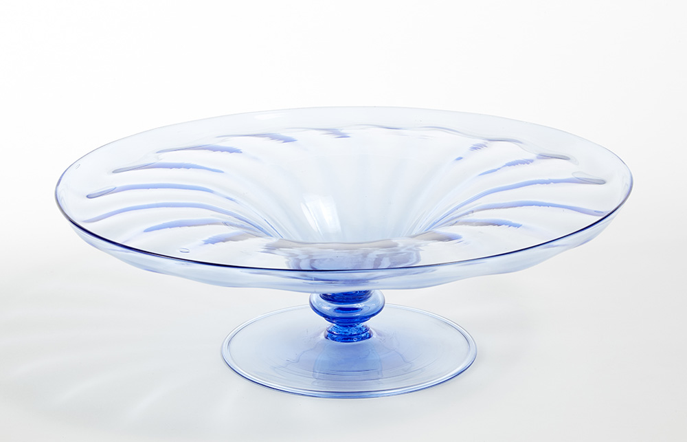 Alzata in vetro soffiato trasparente azzurro con coppa costolata di forma svasata, piede a disco e nodo schiacciato interposto tra piede e coppa. Venini, Murano, 1925-1926. Corrispondente per forme e misure al disegno di fornace n. 3129. (h cm 15; d cm 45) (difetti e restauri)