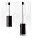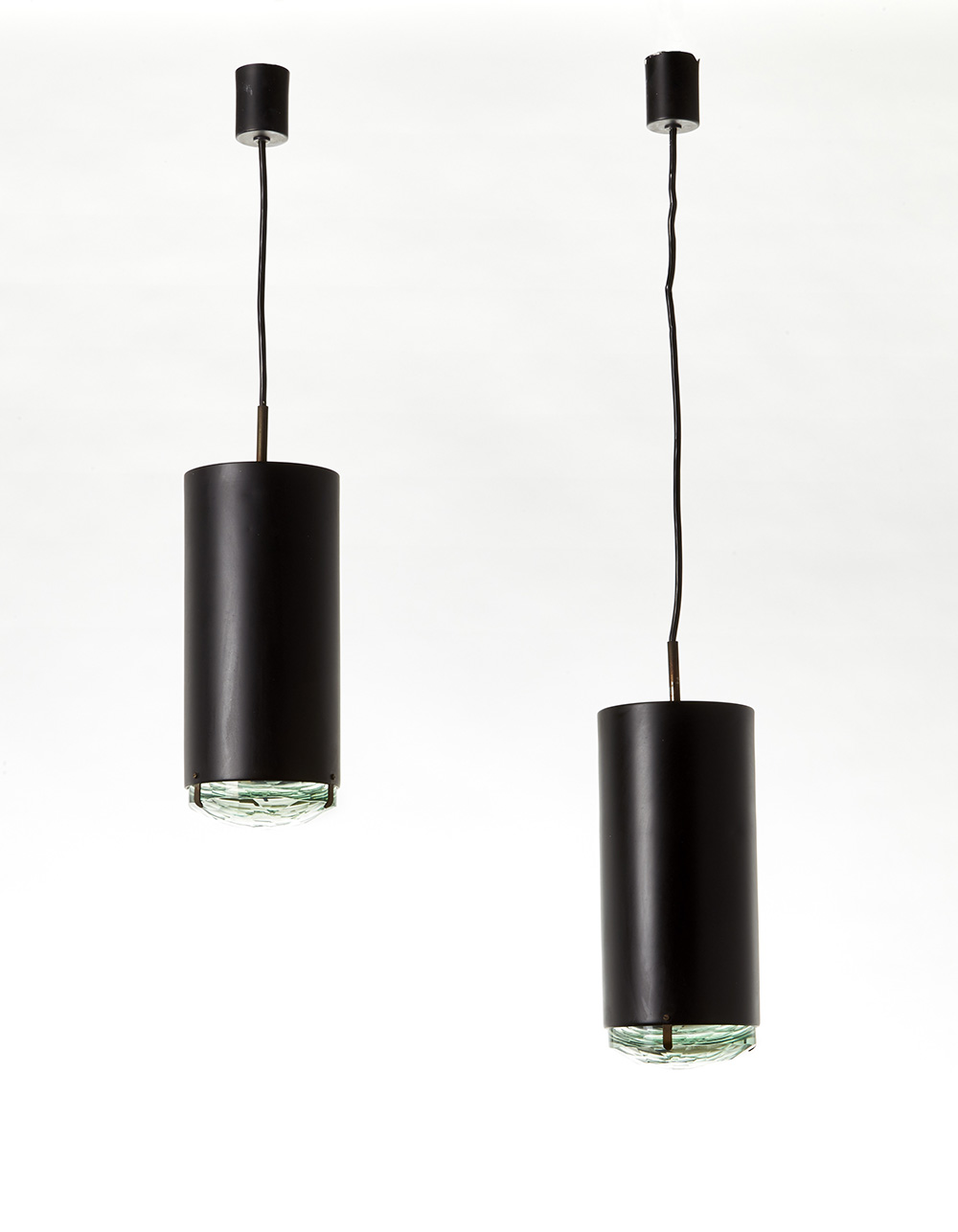 Due lampade a sospensione. Milano, anni '60. corpo cilindrico in alluminio verniciato nero e diffusore in cristallo verdino sfaccettato di grande spessore. (h cm 140) (lievi difetti)
