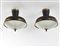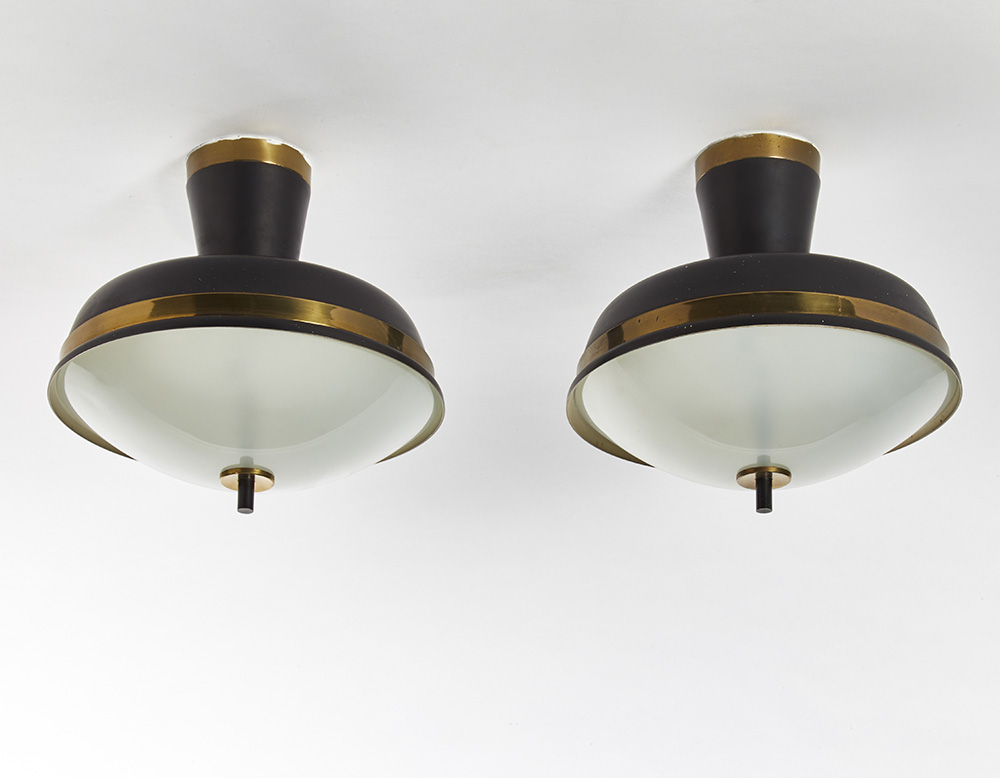 Two ceiling lamps. Produced by Lumi, Milan, 1960s. Satin glass on the inside surface, black and brass painted aluminum structure. Bearing adhesive label inside a lamp. (h 29 cm.; d 32 cm.) (slight defects)