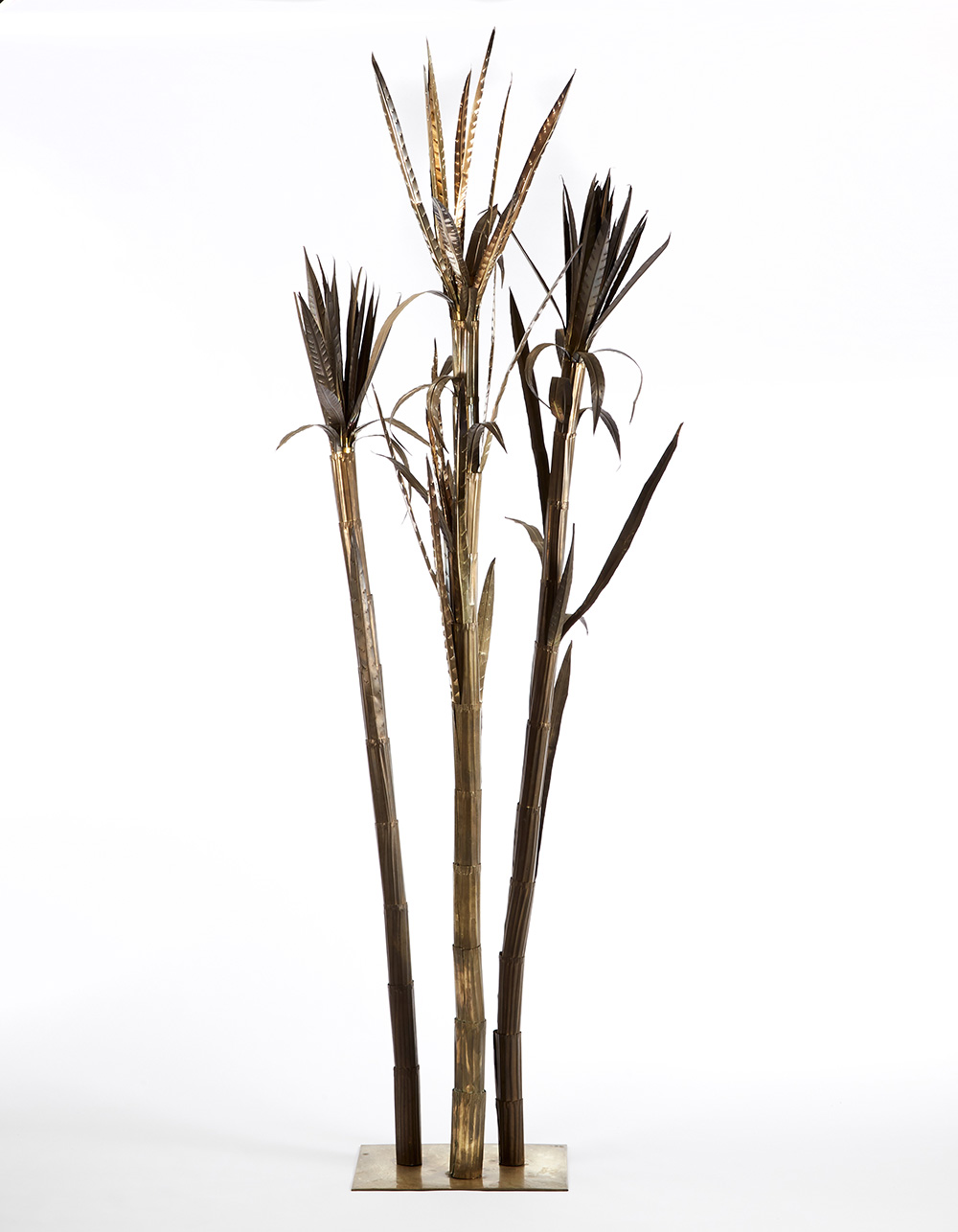 Palma decorative in lamina di ottone sbalzata. Anni '70. (h cm 262) (difetti)