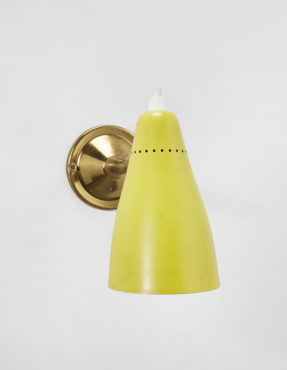 Wall lamp. Produced by O-Luce, Milan, 1950s. Brass structure with bent arm. Perforated aluminium lacquered yellow lampshade. (h 18 cm.) (slight defects)