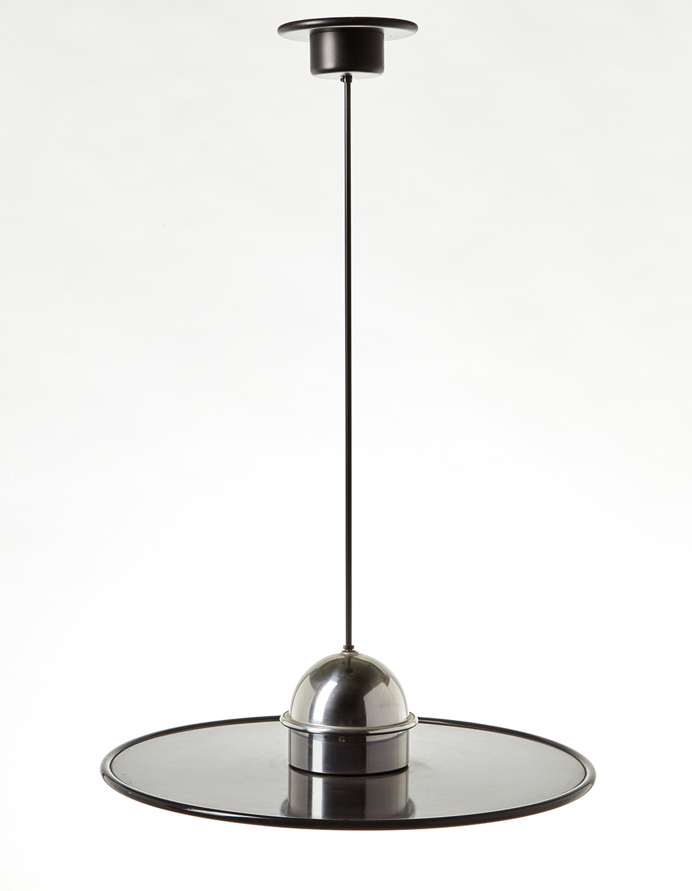 Lampada da sospensione a una luce modello "Lampros 1". Produzione Stilnovo, Milano, 1975ca. Metallo laccato nero e alluminio. (h cm 90,5; d cm 60)