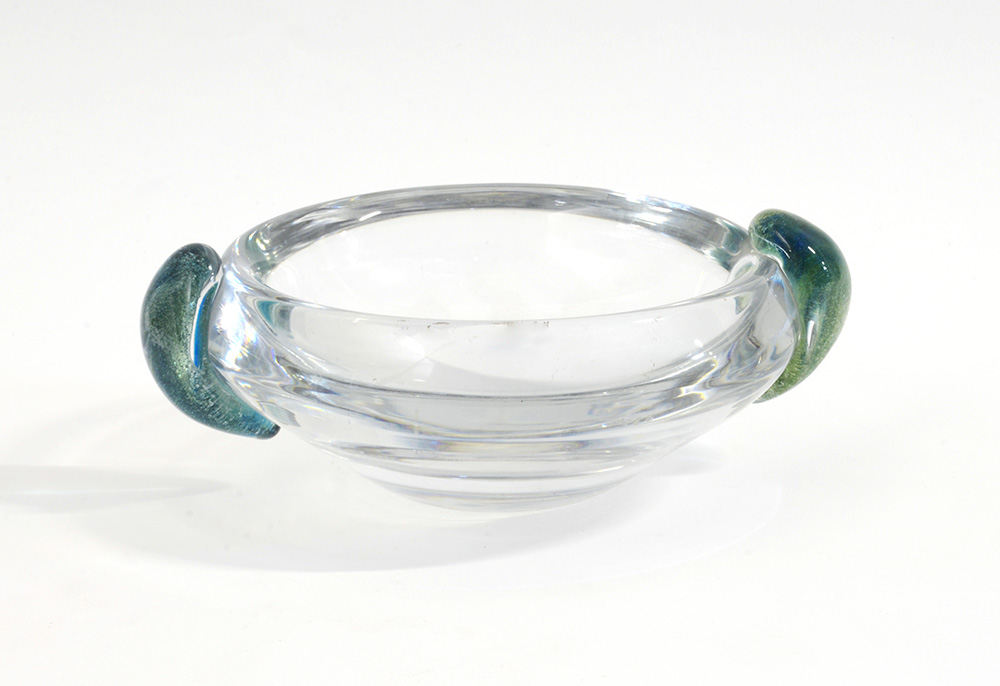 Ciotola in vetro soffiato incolore di forte spessore con morise applicate in vetro sommerso celeste e verde a bolle. Nancy, Francia, seconda metà secolo XX. (d cm 20,5)