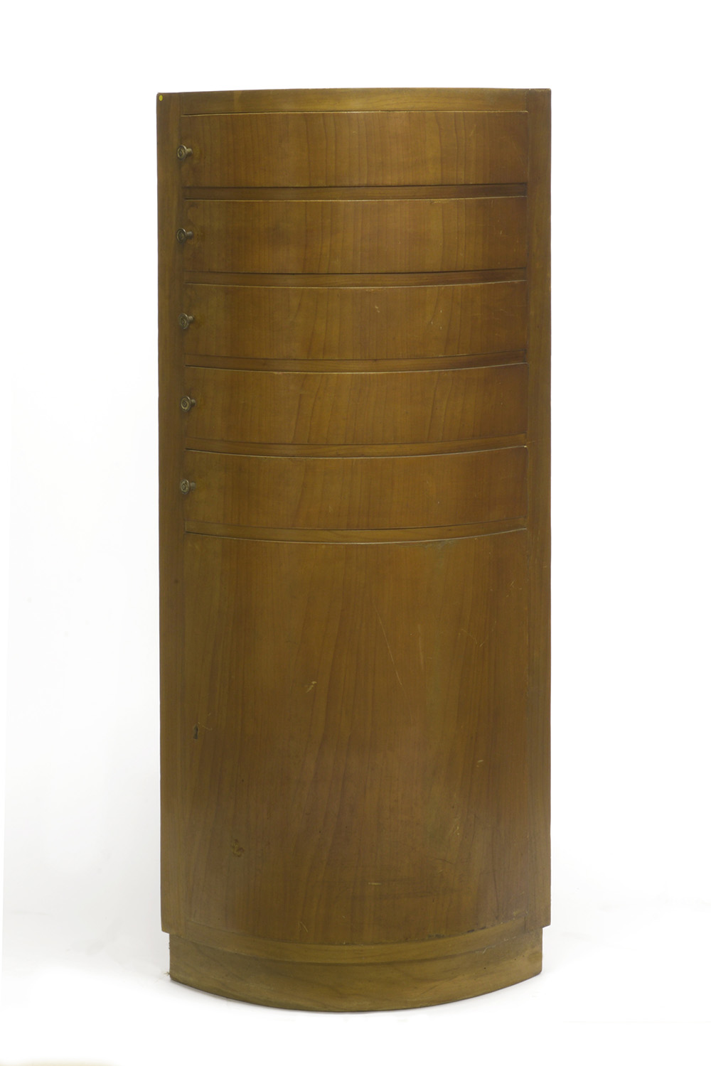 Angoliera lastronata in ciliegio a cinque cassetti e un’anta. Italia, anni '30. (cm 62x140x48,5) (lievi difetti e mancanze)