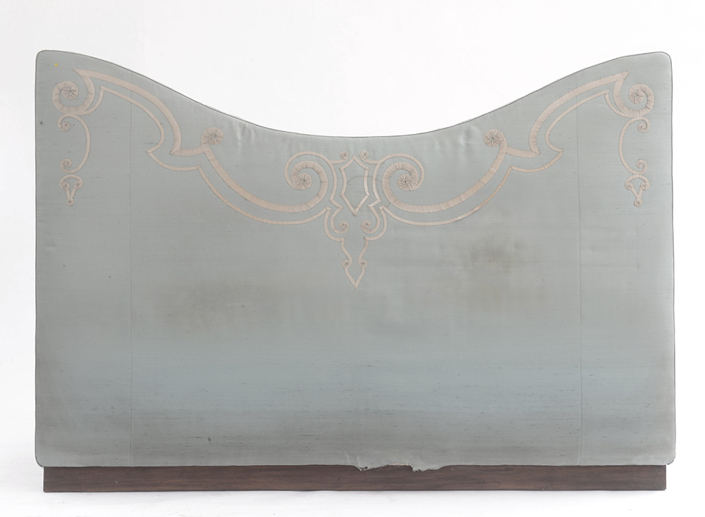 Testata da letto imbottita di forma sagomata. Milano, 1958ca. Rivestimento in tessuto di raso decorato con nastro a volute. (cm 130x184) (difetti)