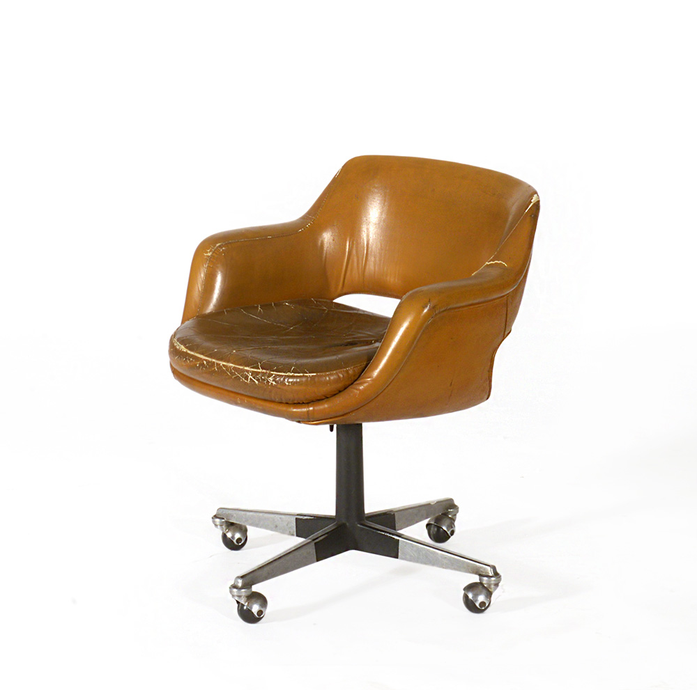Poltroncina a rotelle modello "1106/1 Finlandese". Produzione Cassina, Meda, 1959. Struttura in metallo, seduta imbottita rivestita in similpelle beige. (cm 65x73x51) (gravi difetti)