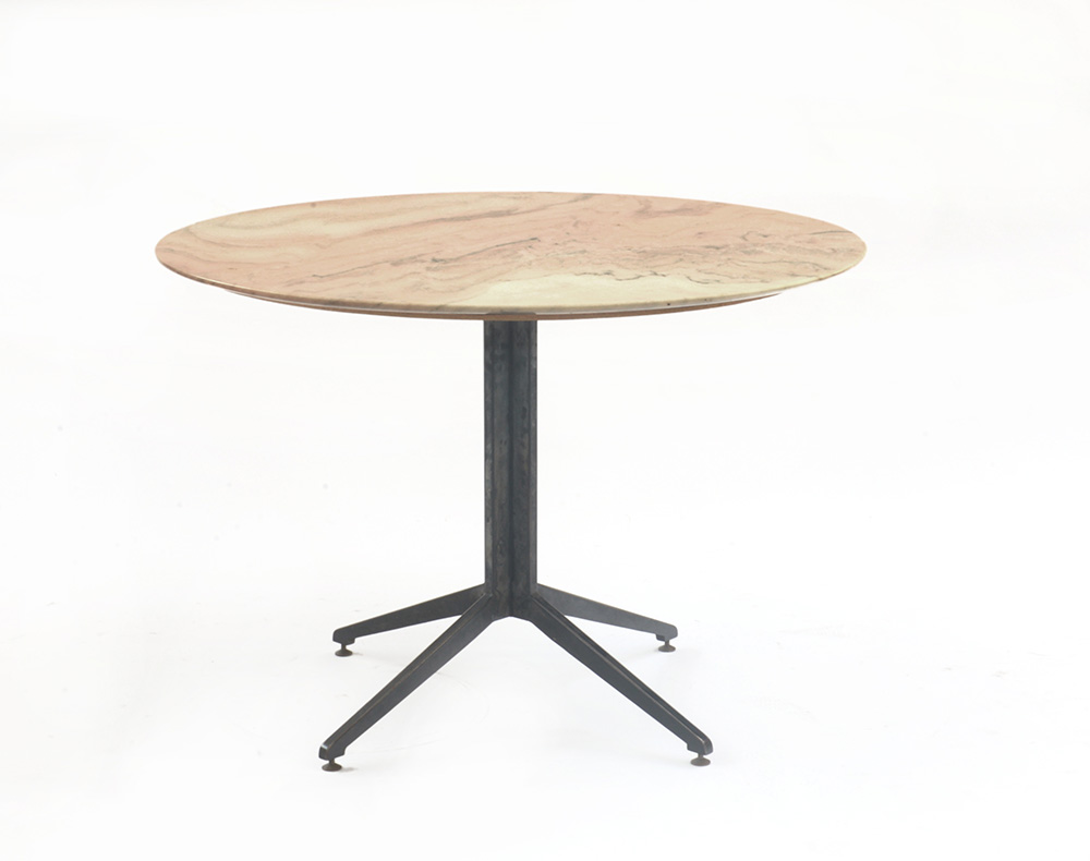 Tavolo tondo con struttura in acciaio verniciato nero, piedini regolabili in ottone e piano in marmo bianco-rosa venato. Italia, anni '60. (h cm 74,5; d cm 110) (difetti e restauri)