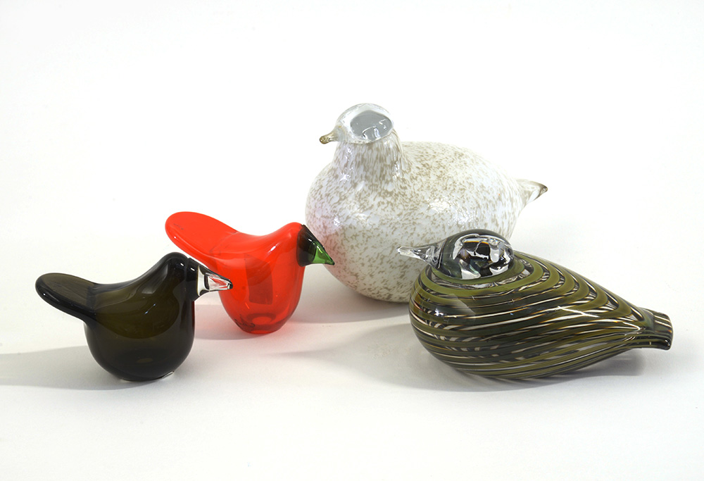 Lotto composto da quattro sculture in vetro raffiguranti uccelli con diverse dimensioni e decorazioni. Esecuzione Iittala, Nuutajärvi Notsjo, seconda metà secolo XX. Alcuni esemplari firmati sotto la base. (misure diverse) (difetti)