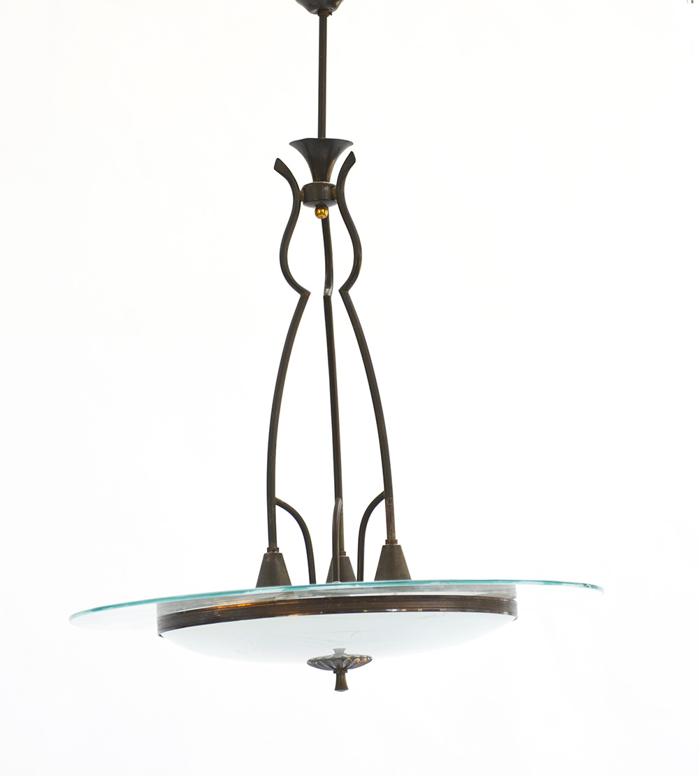 Lampada a sospensione con disco in vetro inciso a getto di sabbia con figurazioni vegetali. Italia, anni '40. (h cm 83; d cm 60) (difetti)