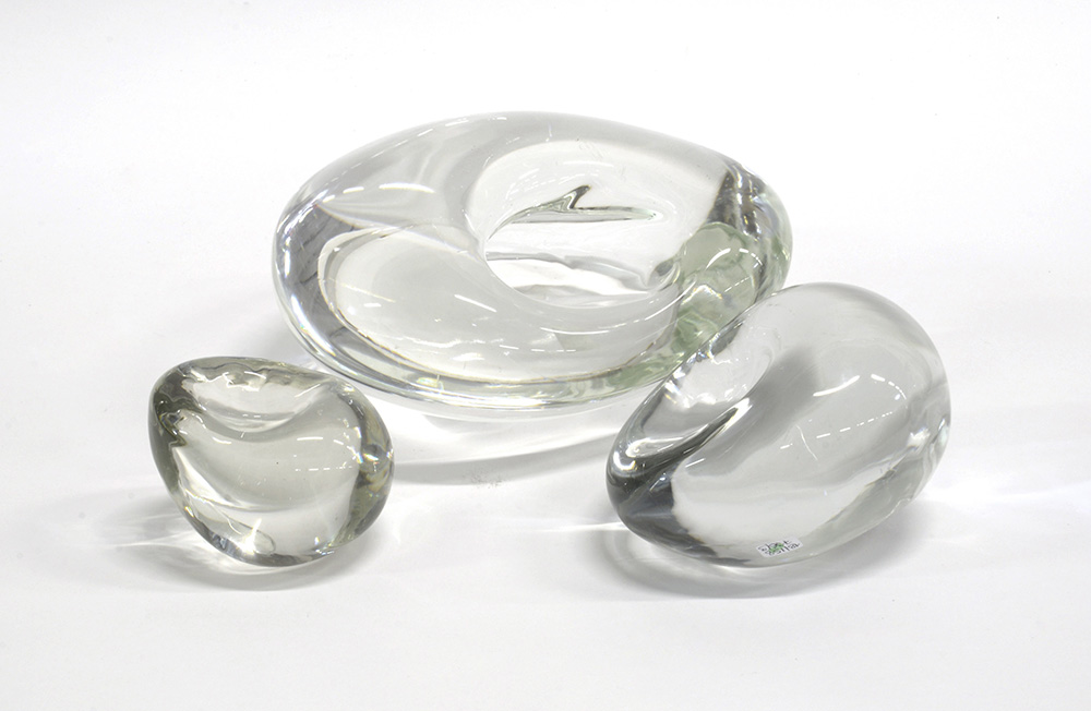 Lotto composto da tre presse papier in vetro massello trasparente incolore. Murano, seconda metà secolo XX. Due esemplari firmati "Barbini" e "Barbini Murano". (misure diverse)