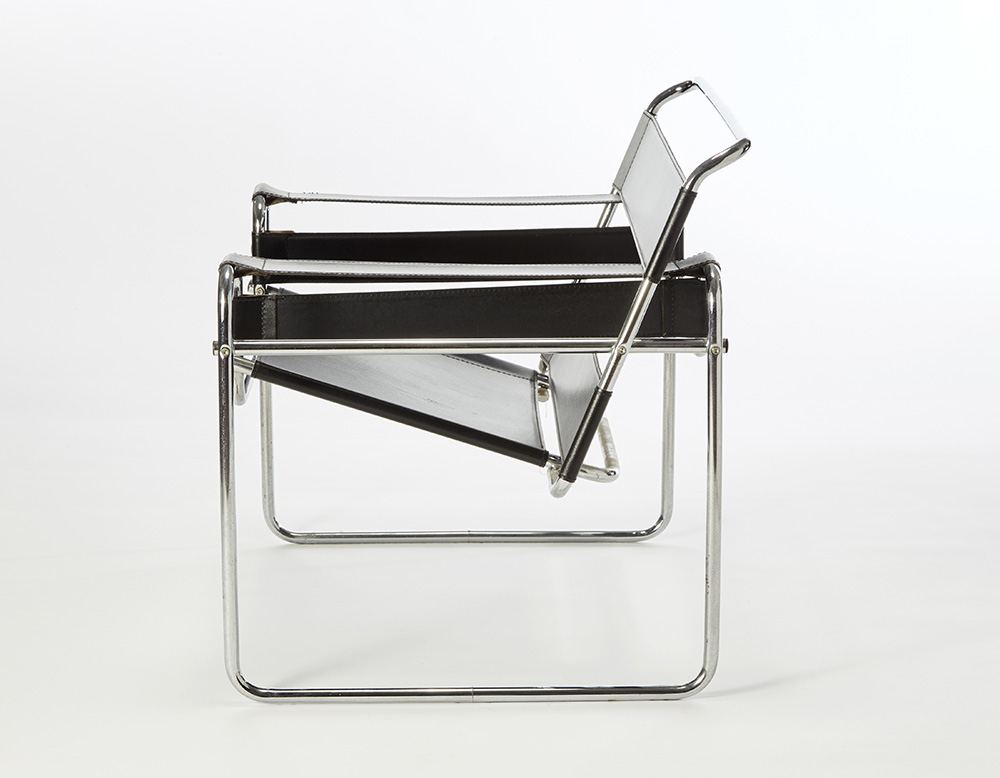* Poltrona ispirata al modello "B3" o "Wassily" di Marcel Breuer. Anni '90. Tubo d'acciaio cromato e cuoio di colore nero. (cm 76x75x64) (lievi difetti)