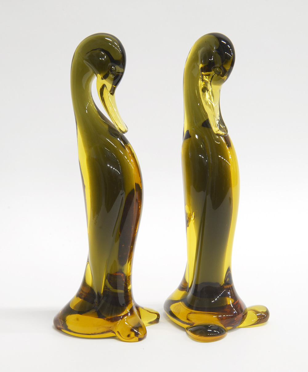 Lotto composto da due sculture in vetro sommerso giallo ambrato raffiguranti due uccelli. Seconda metà secolo XX. (h cm 33)