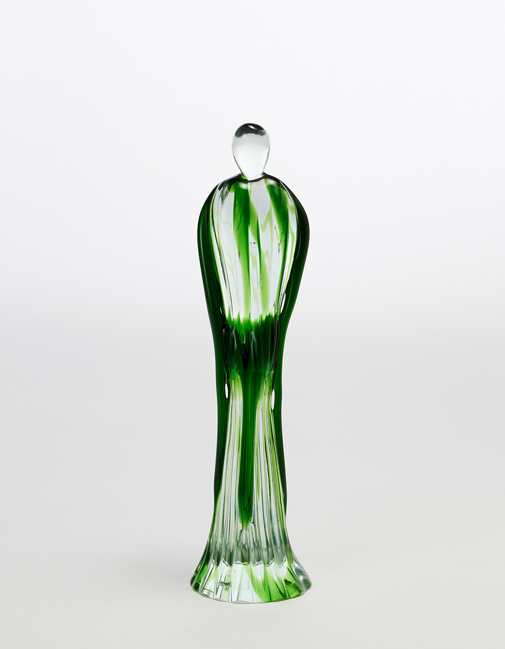 Statuina in vetro sommerso incolore e verde raffigurante silhouette umana. Murano, anni '50. Recante etichetta della manifattura sotto la base. (h cm 41)