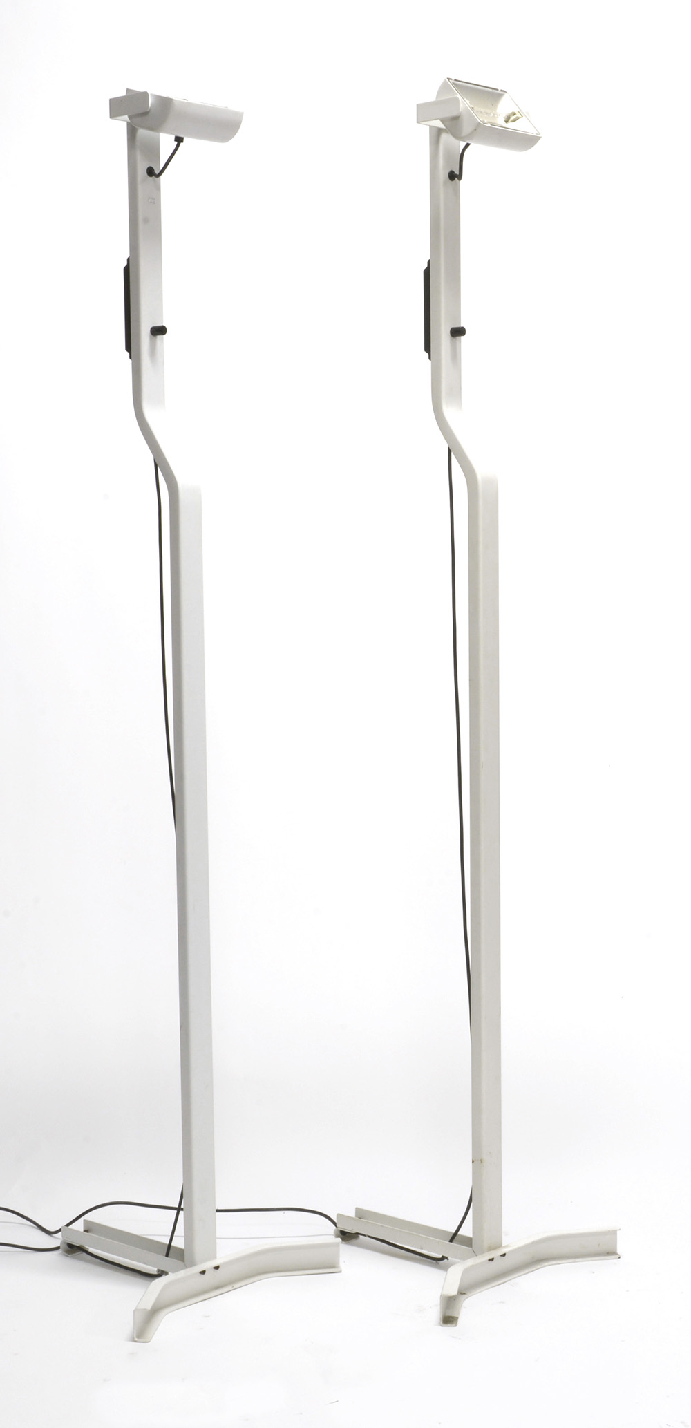 Coppia di lampade da terra modello "Sirio". Produzione Sirrah, Italia, anni '70. Acciaio laccato bianco opaco. (h cm 191) (lievi difetti)