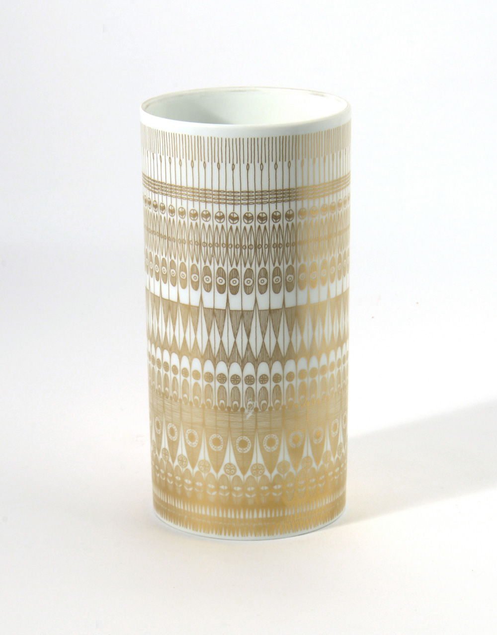 Vaso cilindrico in porcellana decorato con serigrafia in oro. Manifattura Rosenthal - Serie "Studio Linie", Germania, anni '70. (h cm 25; d cm 12,5)