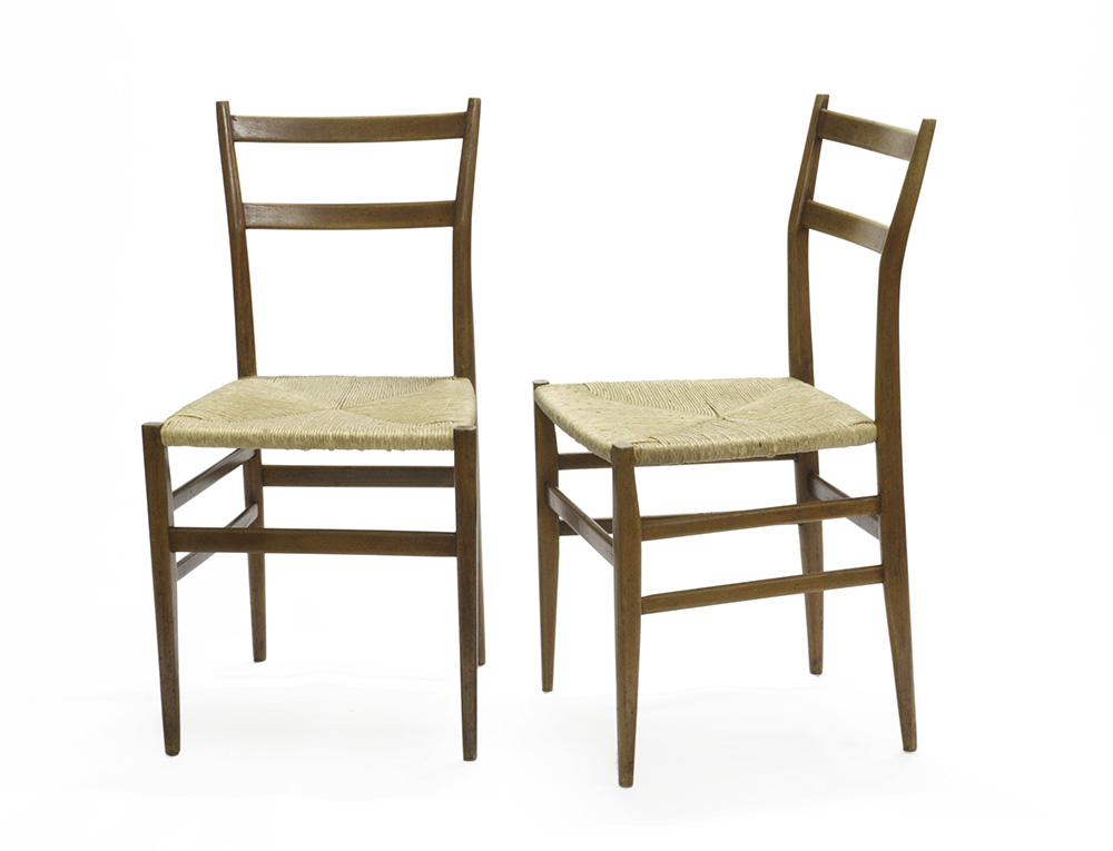 Coppia di sedie in legno di frassino con seduta impagliata, ispirate al modello “646 Leggera” di Gio Ponti. (cm 44x83x44,5) (lievi difetti)
