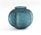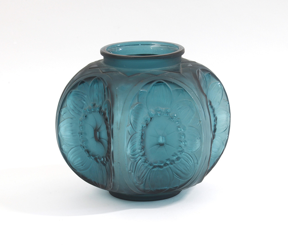 Vaso in vetro soffiato in stampo verde trasparente decorato a rilievo con fiori e acidato sulla superficie esterna. Prima metà secolo XX. (h cm 19) (lievi difetti)