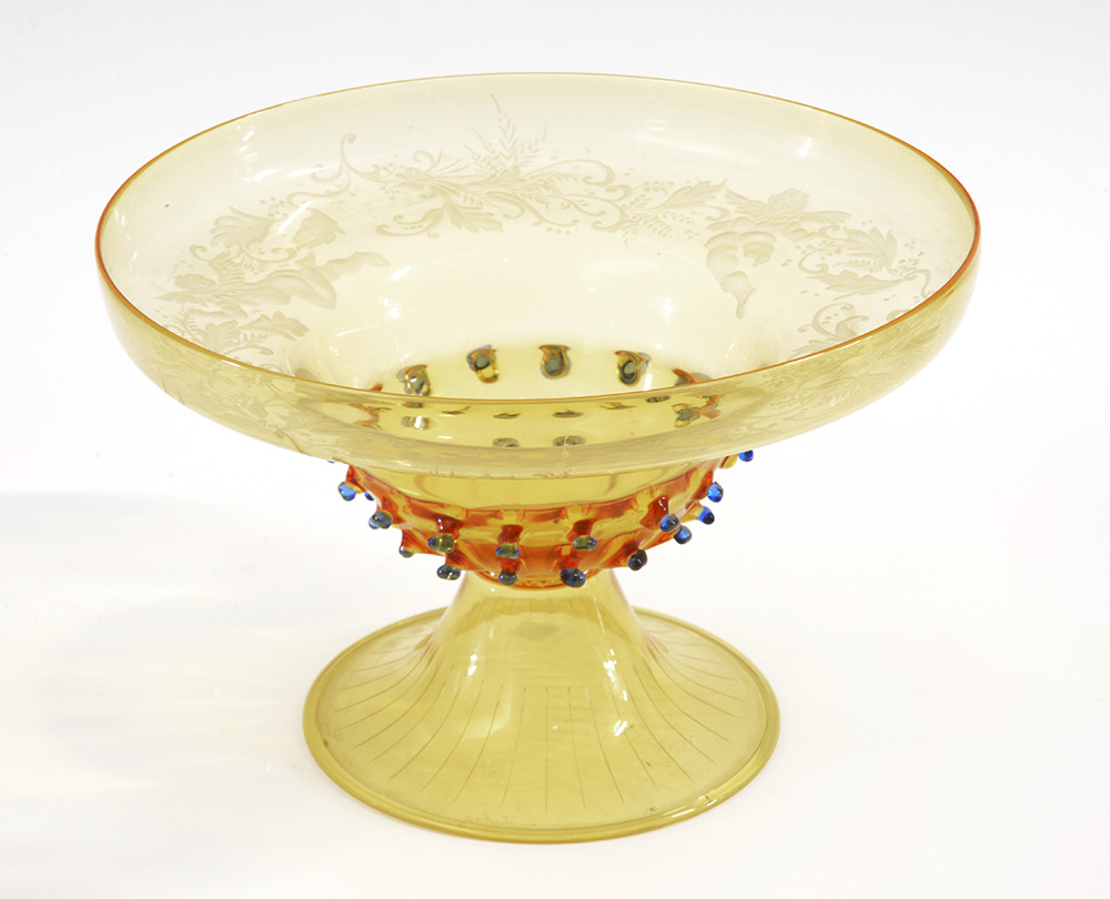 Alzata in vetro soffiato arancione con applicazioni blu e incisioni alla ruota. Murano, secolo XX. Recante firma "Tagliapietra Murano" incisa a punta alla base. (h cm 18; d cm 26,5)