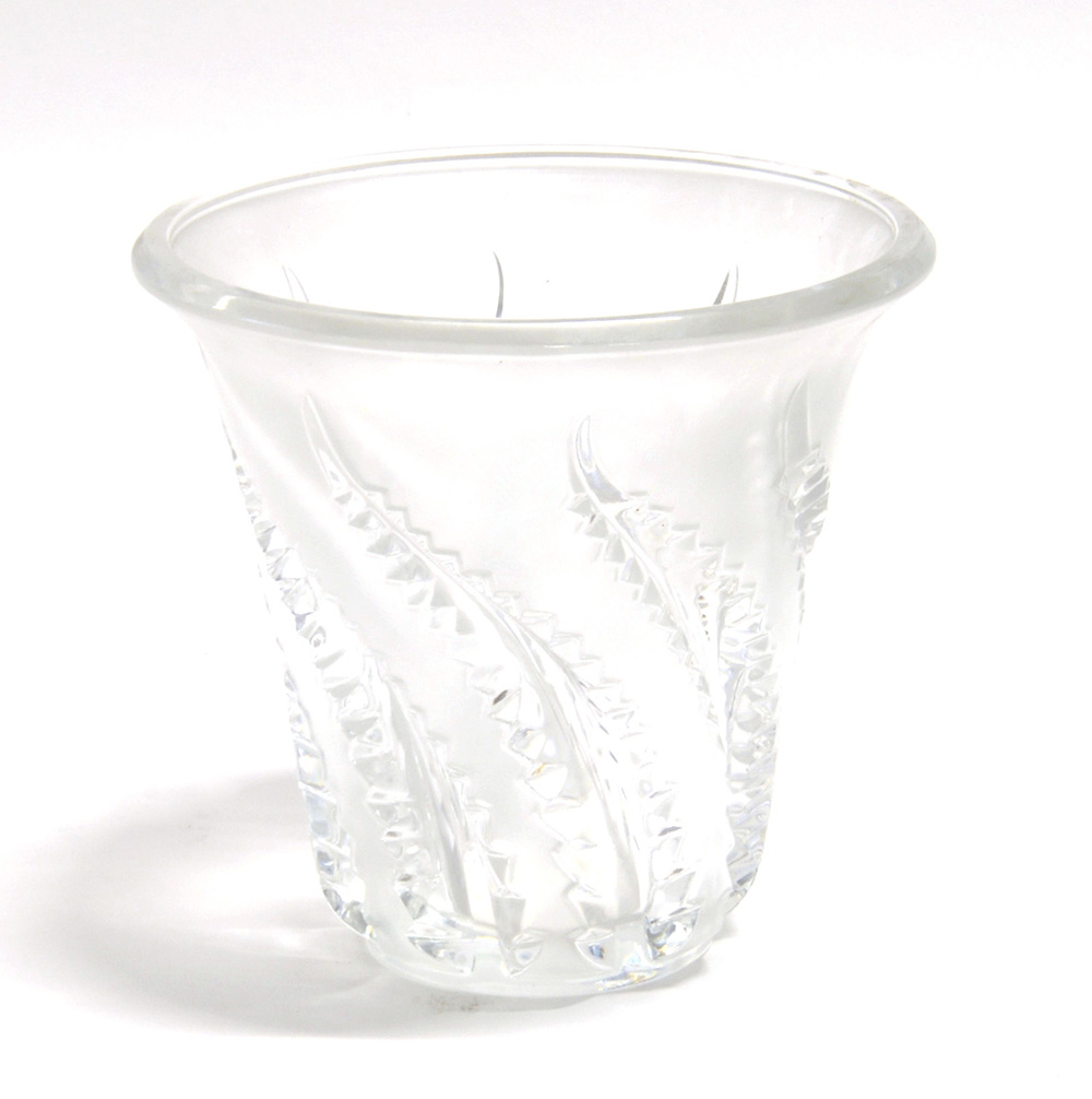 Vaso troncoconico a bocca svasata in vetro stampato con motivo a foglie trasparenti formate a bassorilievo. Francia, seconda metà secolo XX. Firmato a punta sotto la base "Lalique France". (h cm 20; d cm 20)