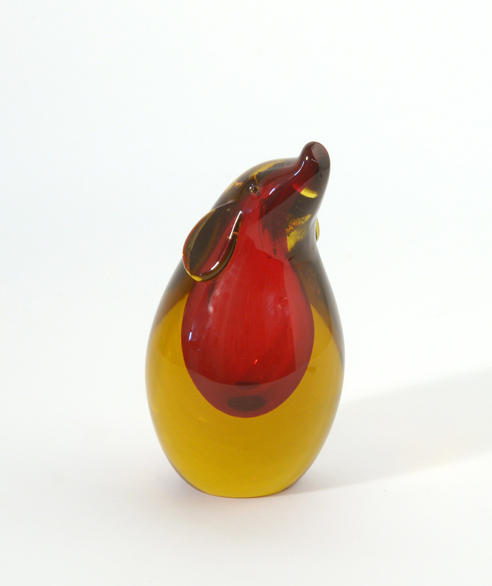 Scultura in vetro sommerso trasparente giallo ambrato e rosso. Seconda metà secolo XX. (h cm 20)
