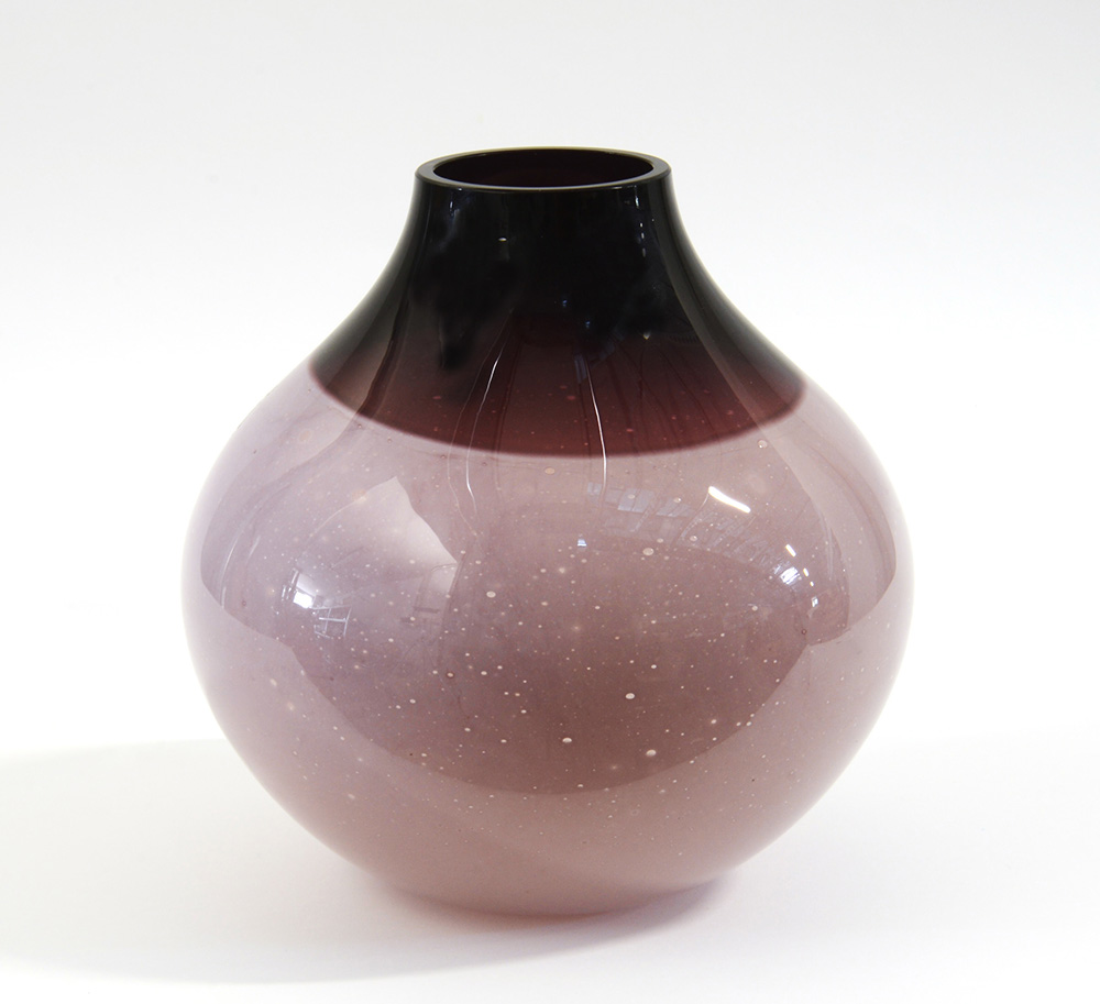 Vaso in vetro soffiato ametista trasparente con applicazione lattimo sulla superficie interna. Murano, anni '80. (h cm 23)