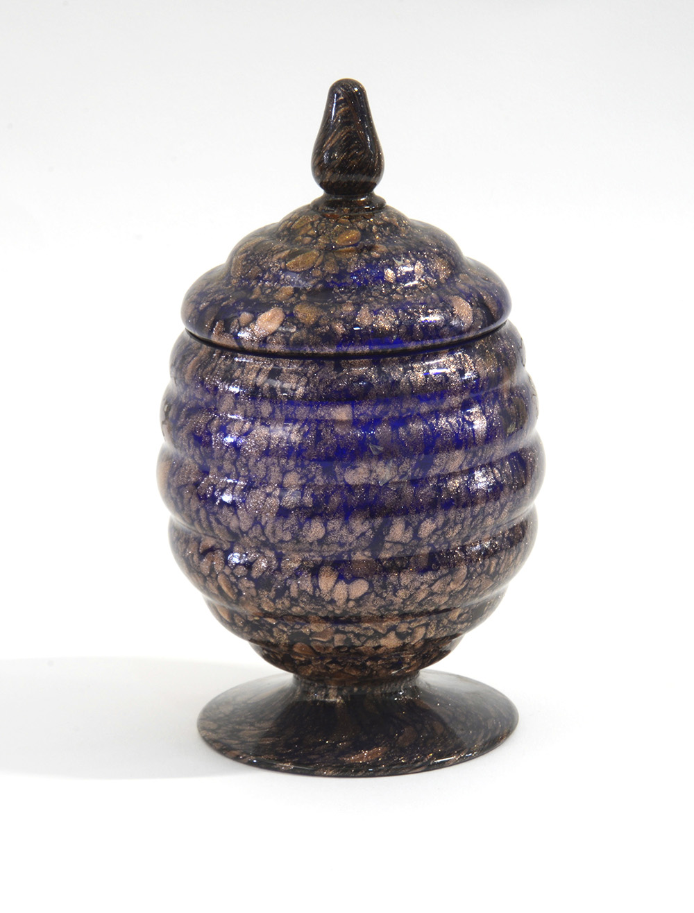 Compostiera in vetro soffiato blu e avventurina. Con coperchio. Produzione recente. (h cm 21) (lievi difetti)