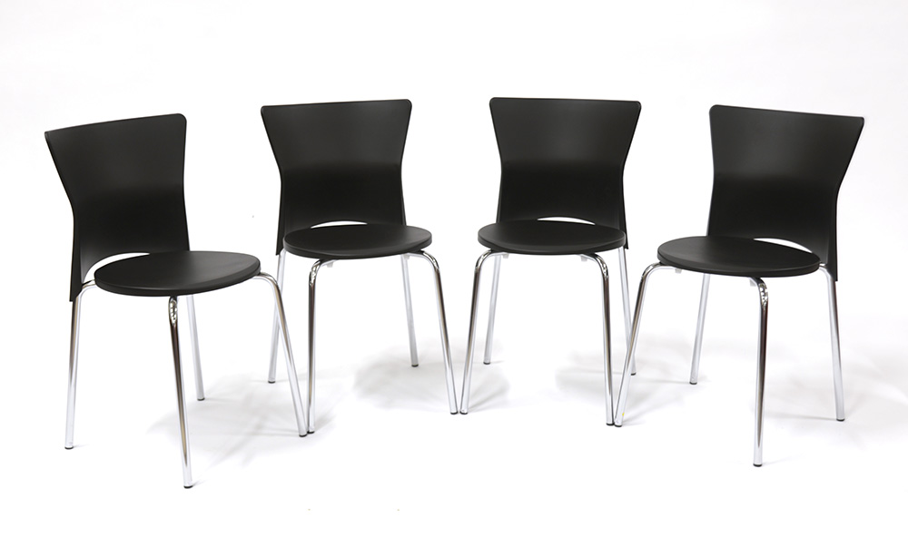 Lotto composto da quattro sedie modello "Isis". Produzione Sintesi. Acciaio e polipropilene nero. (cm 42x77x50)