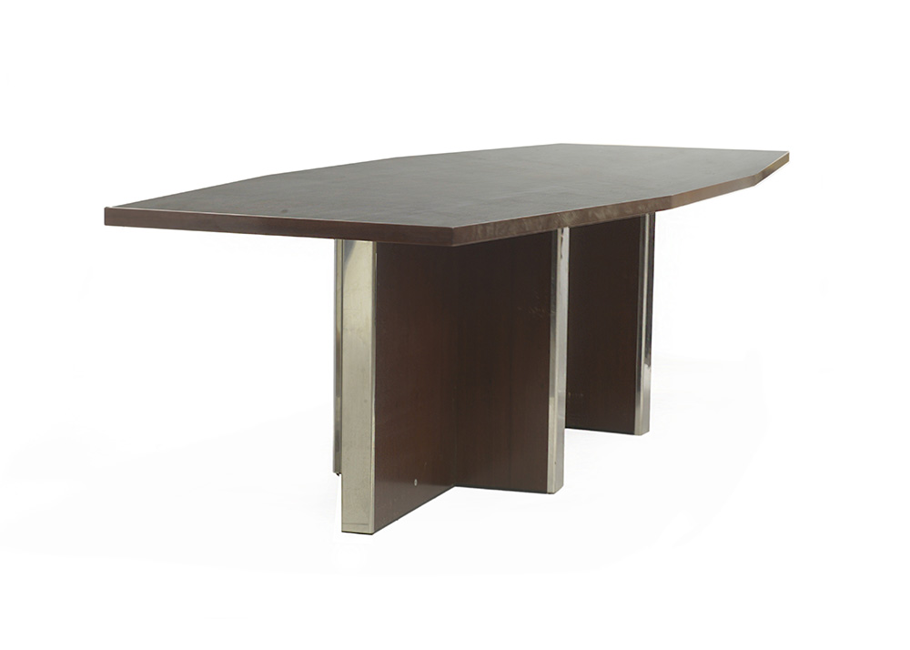 Desk and writing desk for typist of the series "Galileo".. Veneered wood in Indian rosewood and stainless steel bands. (300x47x110 cm.) (defects)