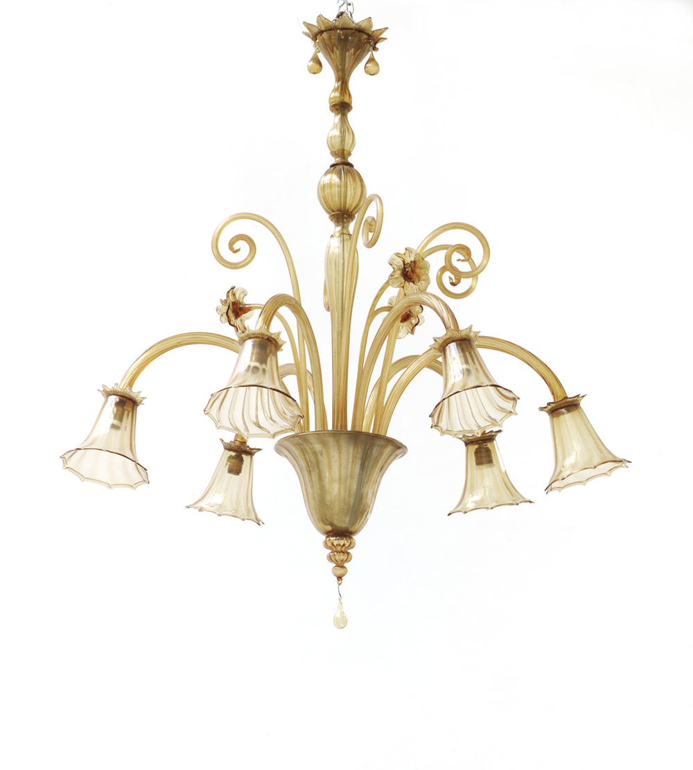 Manifattura di Murano Lampada a sospensione a sei luci in vetro pagliesco,...