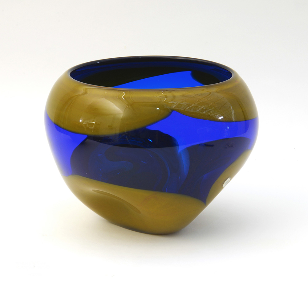 Colourless blue and orange-yellow stained glass vase. Murano, 1990s. Signed under the base "Seguso Viro Murano". (h 18.3 cm.; d 20 cm.)
