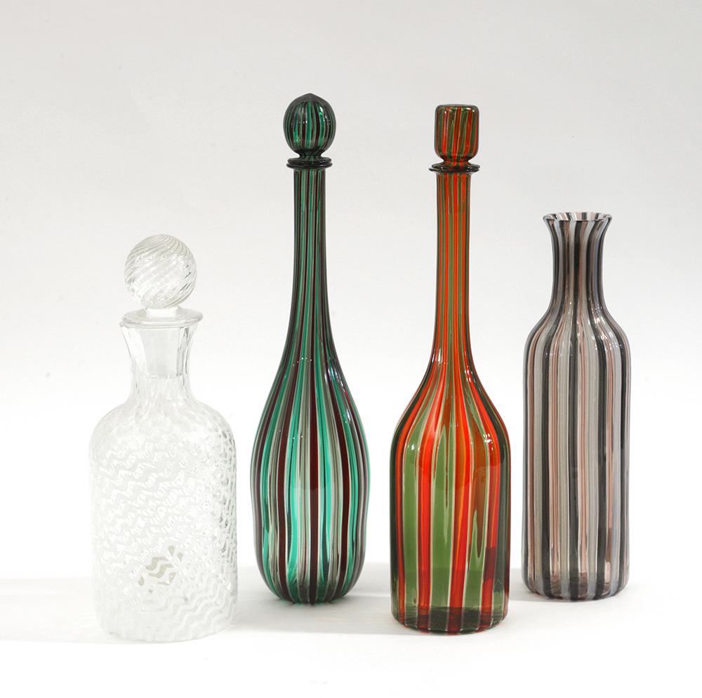 Gruppo di quattro bottiglie in vetro soffiato a canne di vari colori. Anni '60. Recanti etichetta cartacea "Salviati". (h max cm 38) (difetti)