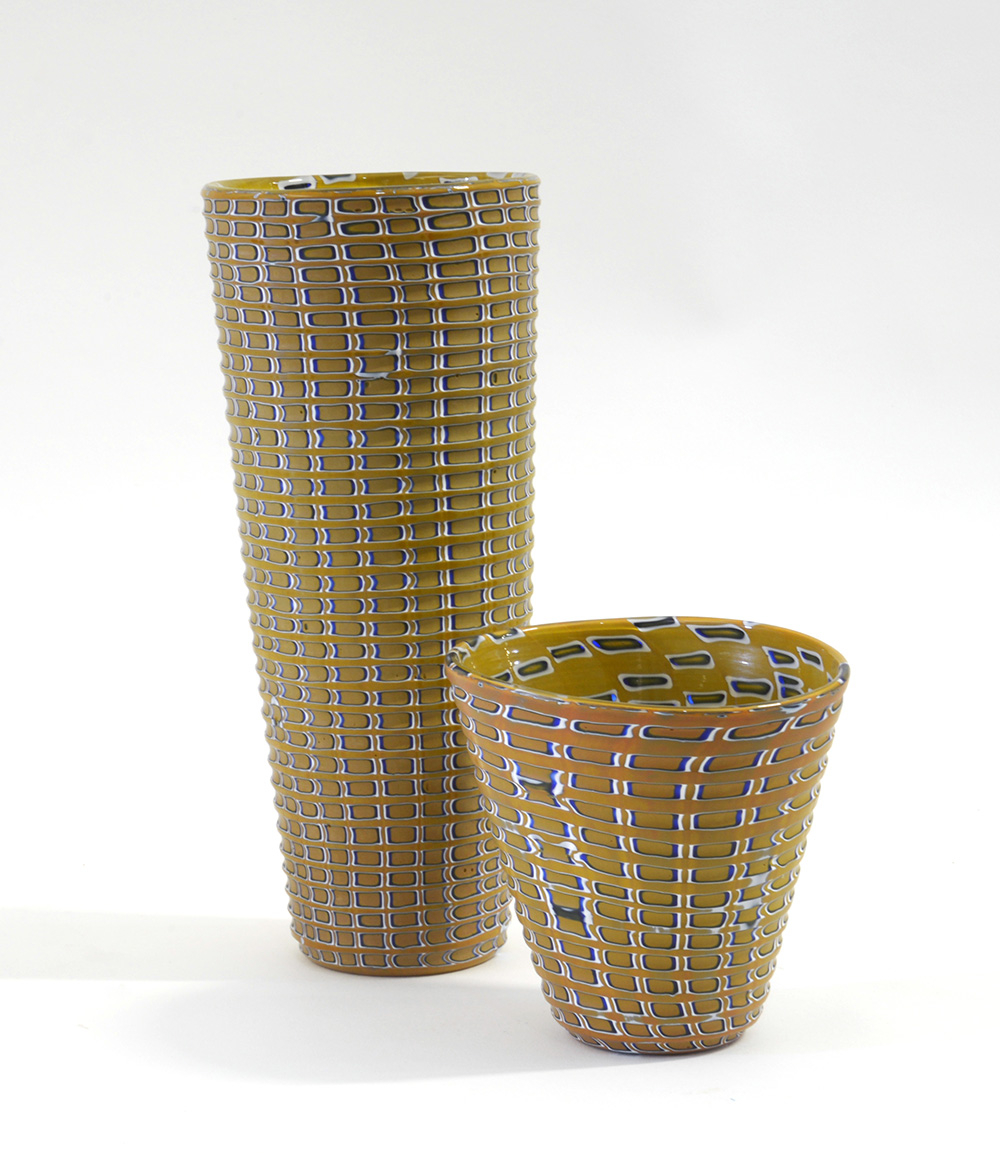 Lotto di due vasi in vetro soffiato opaco lavorato a murrine e a rilievo nei toni dell'ocra, bianco e blu. Murano, 2001. Firmato e datato a punta sotto la base. (h cm 12; h cm 27)