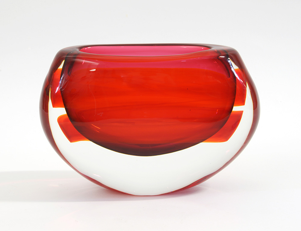 Vaso a sezione schiacciata in vetro sommerso incolore rosso e vinaccia. Salviati, Murano, seconda metà secolo XX. (h cm 20)