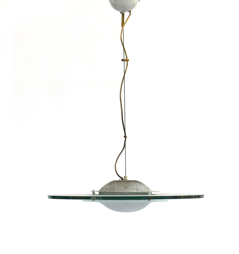 Suspension lamp with glass disc glazed on the external surface, white painted metal and brass structure. Italy, 1970s. (h 80 cm.; d 60 cm.) (slight defects)