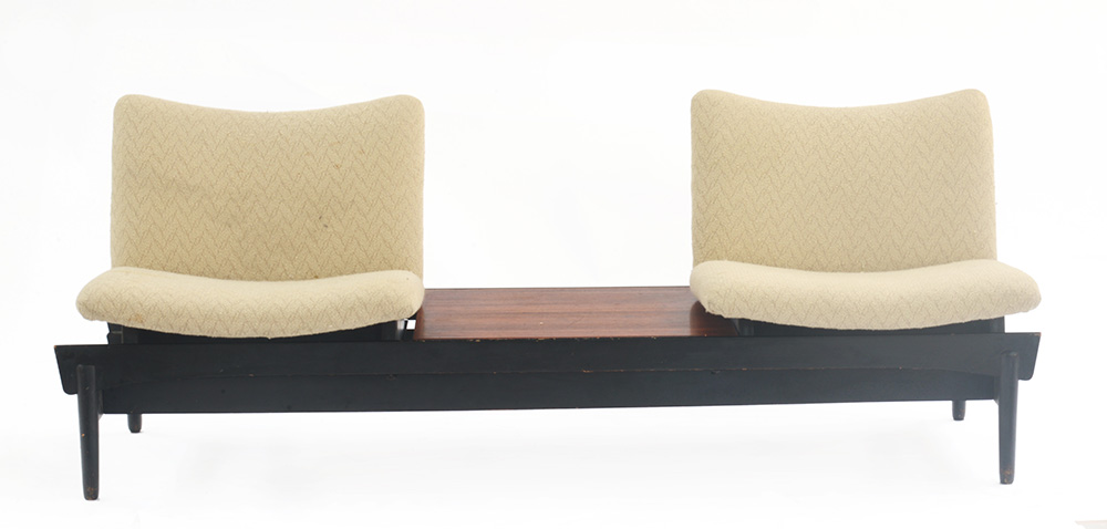 Divano con due sedute e un ripiano mobili. Produzione Bramin, Danimarca, anni '50. Legno massello tinto nero e impiallacciato in teak, sedute imbottite rivestite in tessuto beige. (cm 180x77x59) (difetti e mancanze)
