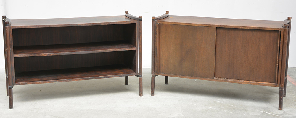 Lotto di due mobili modello "Archimede". Produzione Gavina, San Lazzaro di Savena, 1961. Legno multistrato impiallacciato in palissandro indiano, ante scorrevoli con maniglie in massello e ripiani a vista. (cm 117x74x44) (difetti)