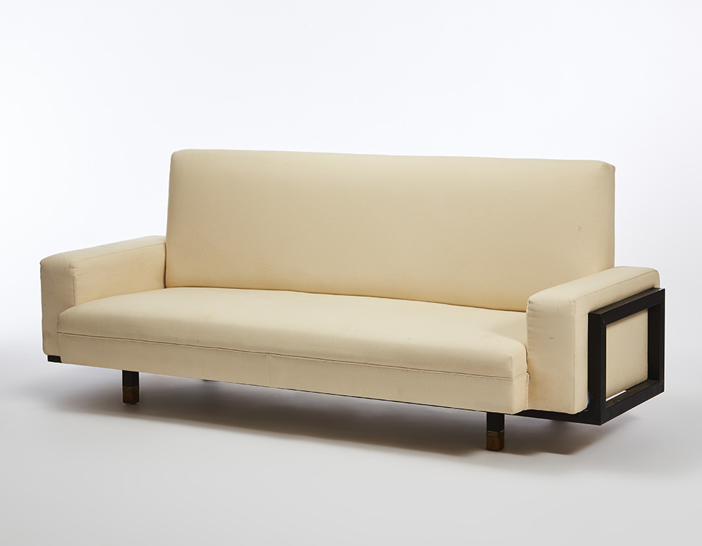 Divano imbottito. Esecuzione Arredamenti Borghi, Cantù, 1964/1965. Struttura in profilato metallico verniciato nero, puntali in ottone e legno massello, rivestimento in tessuto beige. (cm 201x79x77) (difetti)