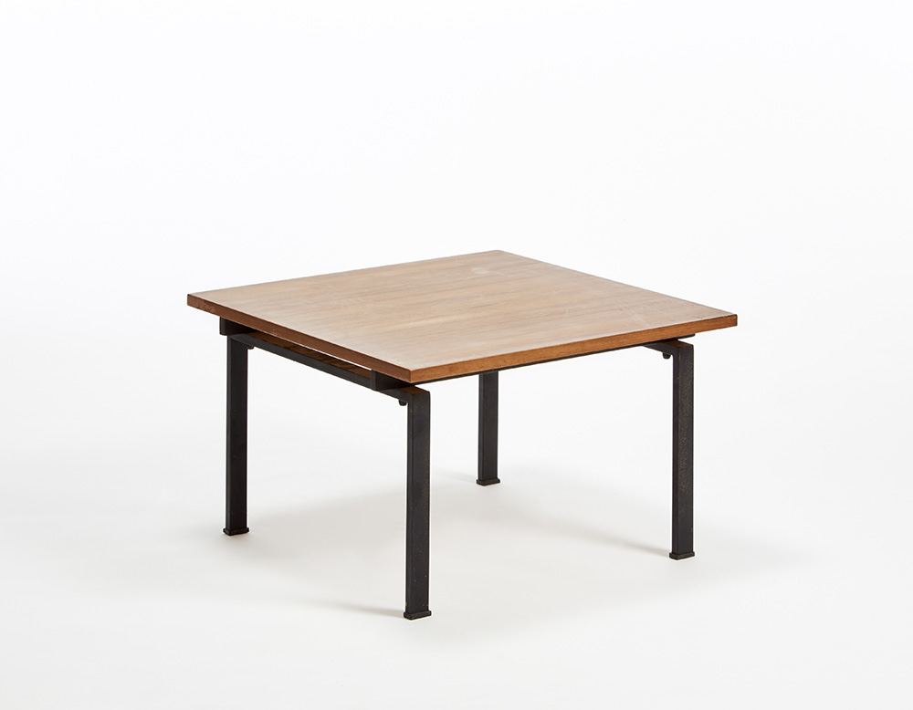 Tavolino da salotto. Ponte S Pietro (Bergamo), anni '50. Struttura in metallo verniciato nero e piano quadrato impiallacciato in legno teak. (cm 65x36x65) (lievi difetti)