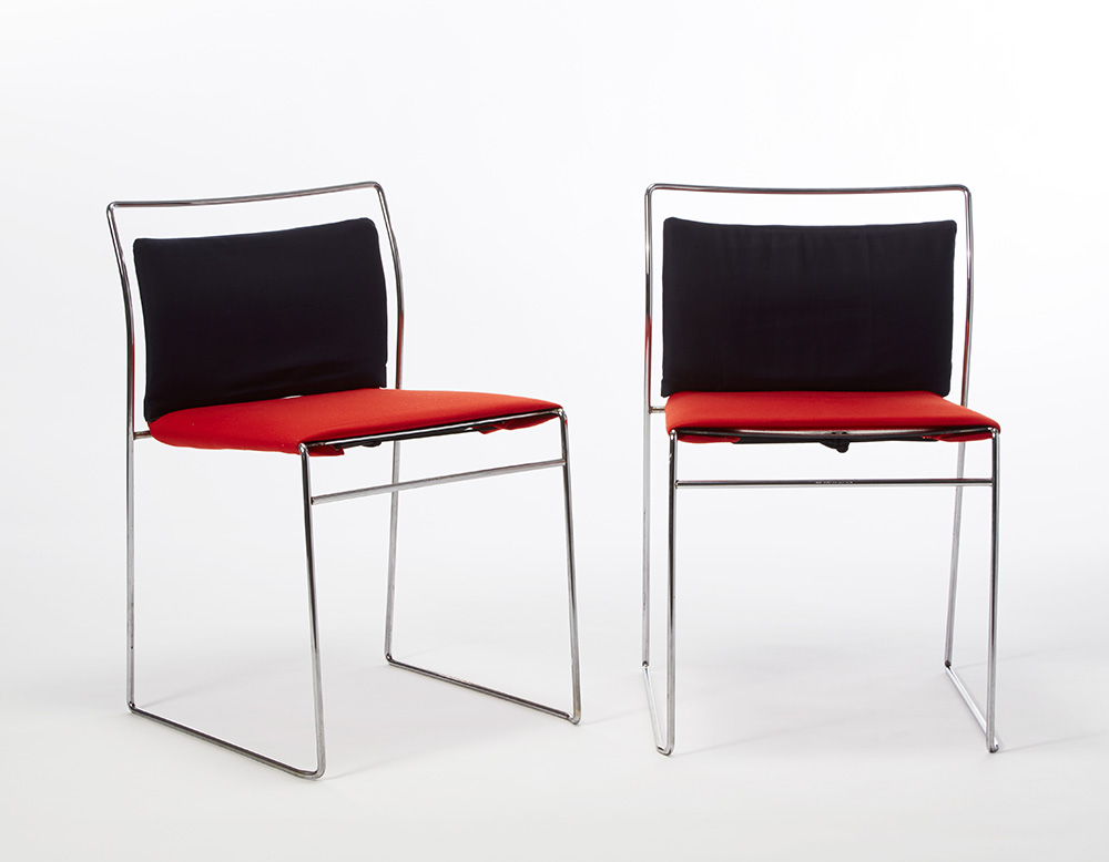 * Coppia di sedie modello "Tulu". Produzione Simon, Italia, 1969. Struttura in tondino d'acciaio trafilato e cromato; schienale in tessuto nero e seduta in panno rosso. (cm 45,5x73x42,5)