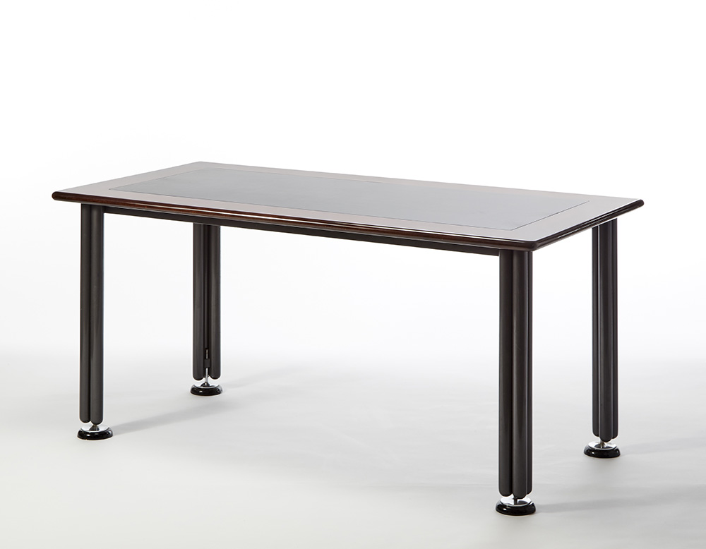 Tavolo rettangolare modello "Tripletta". Produzione Azucena, Milano, anni '70. Piano in legno, inserto in pelle e quattro gambe in metallo. (cm 160x75x80) (difetti)