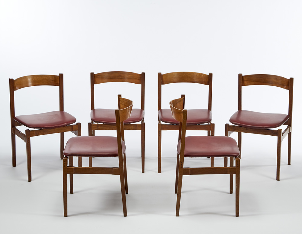 Lotto composto da sei sedie modello "101". Produzione Cassina, Meda, 1959. Legno massello di noce con incastri a vista, seduta con rivestimento in similpelle bordeaux. (cm 44x76x41) (lievi difetti)