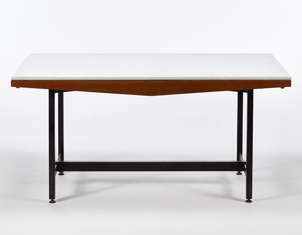 Tavolo da pranzo. Esecuzione Arredamenti Borghi, Cantù, 1964/1965. Piano rettangolare in marmo bianco, struttura in legno massello e profilato d'acciaio verniciato nero, piedini regolabili in ottone. (cm 160x78x85) (lievi difetti)
