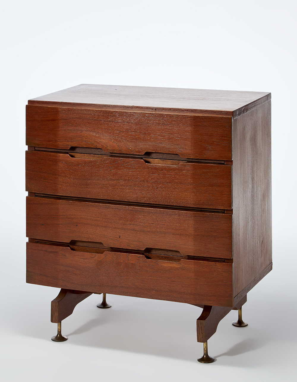 Cassettiera a quattro cassetti. Produzione Gbl, Lecco, 1959ca. Legno di teak bordato e impiallacciato, piedini in ottone tornito. (cm 66x73x43) (lievi difetti)