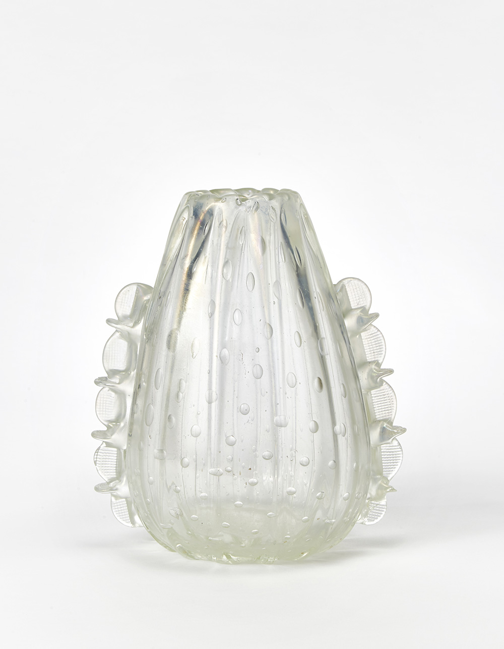 A morise vase in colorless ribbed glass with regular inclusion of bubbles, iridescent on the external surface. Murano, 1930s. (h 23 cm.) (defects)